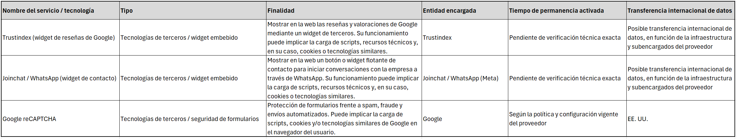 Y los siguientes servicios y tecnologías de terceros integradas en la web: